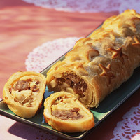 Roulez le feuilleté pour emprisonner la farce et fermez les extrémités en les pinçant. Dorez-le au jaune d’œuf délayé dans un peu d’eau. Posez le feuilleté sur la plaque du four et enfournez 20 min.